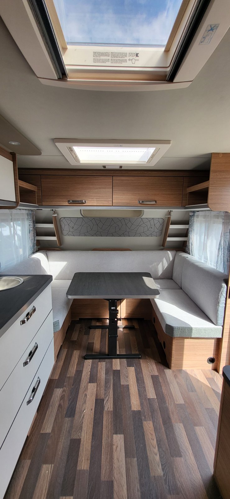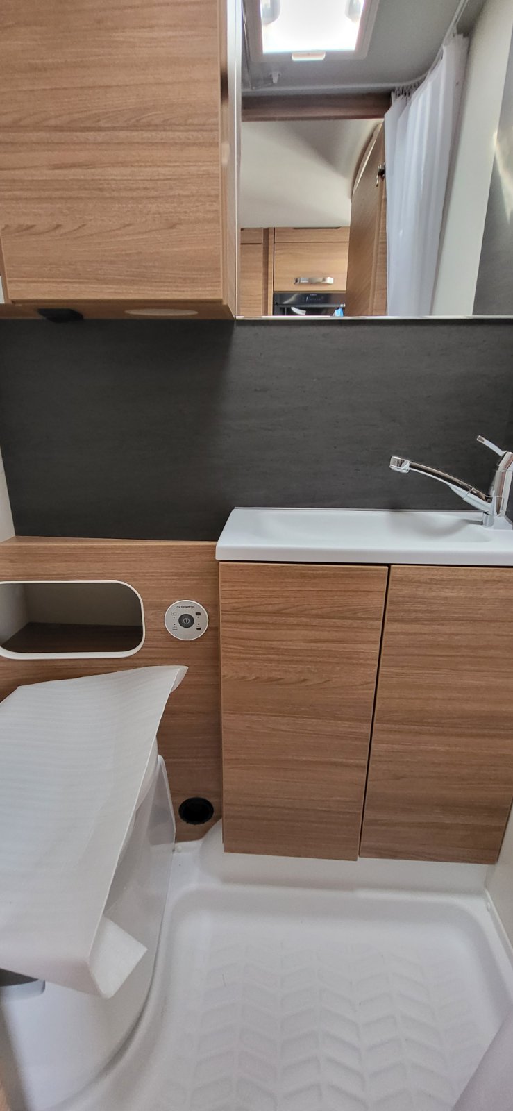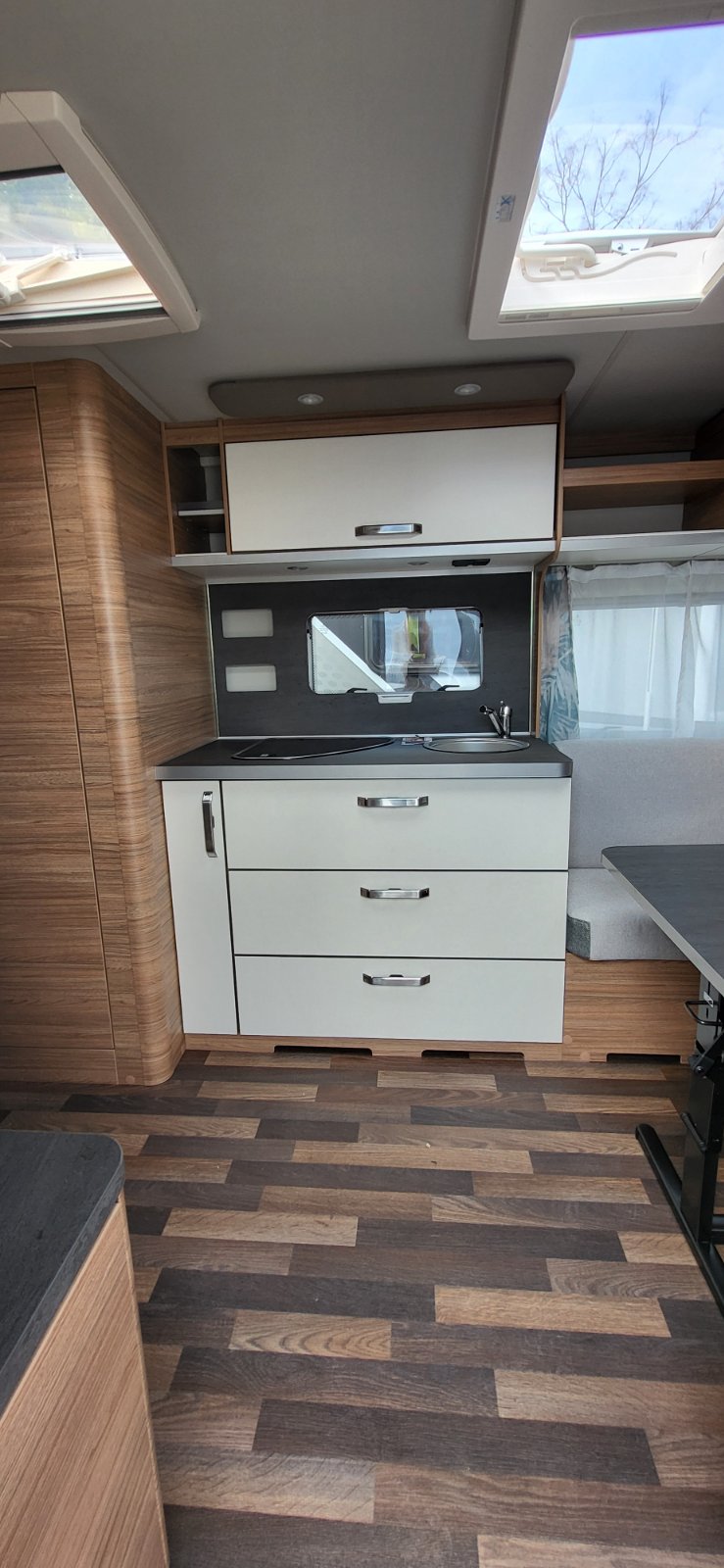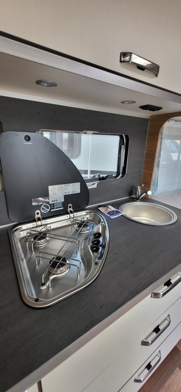 Mosogató, hűtő, tűzhely, 12V-os körfűtés, toronyhűtő, zuhanyfülke zuhanytálcával, beépített mosdóval és bio-Wc-vel, kombiroló, hideg-meleg vízrendszer, 45l-es beépített víztartály, 25l-es mobil szennyvíztartály, panoráma tetőablak, stabilizátoros vonófej, szúnyoghálós ajtó