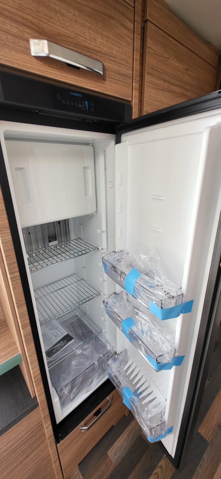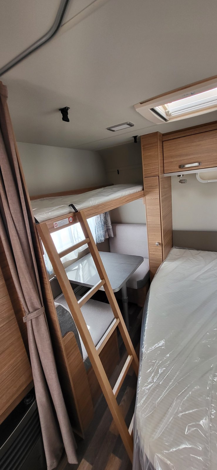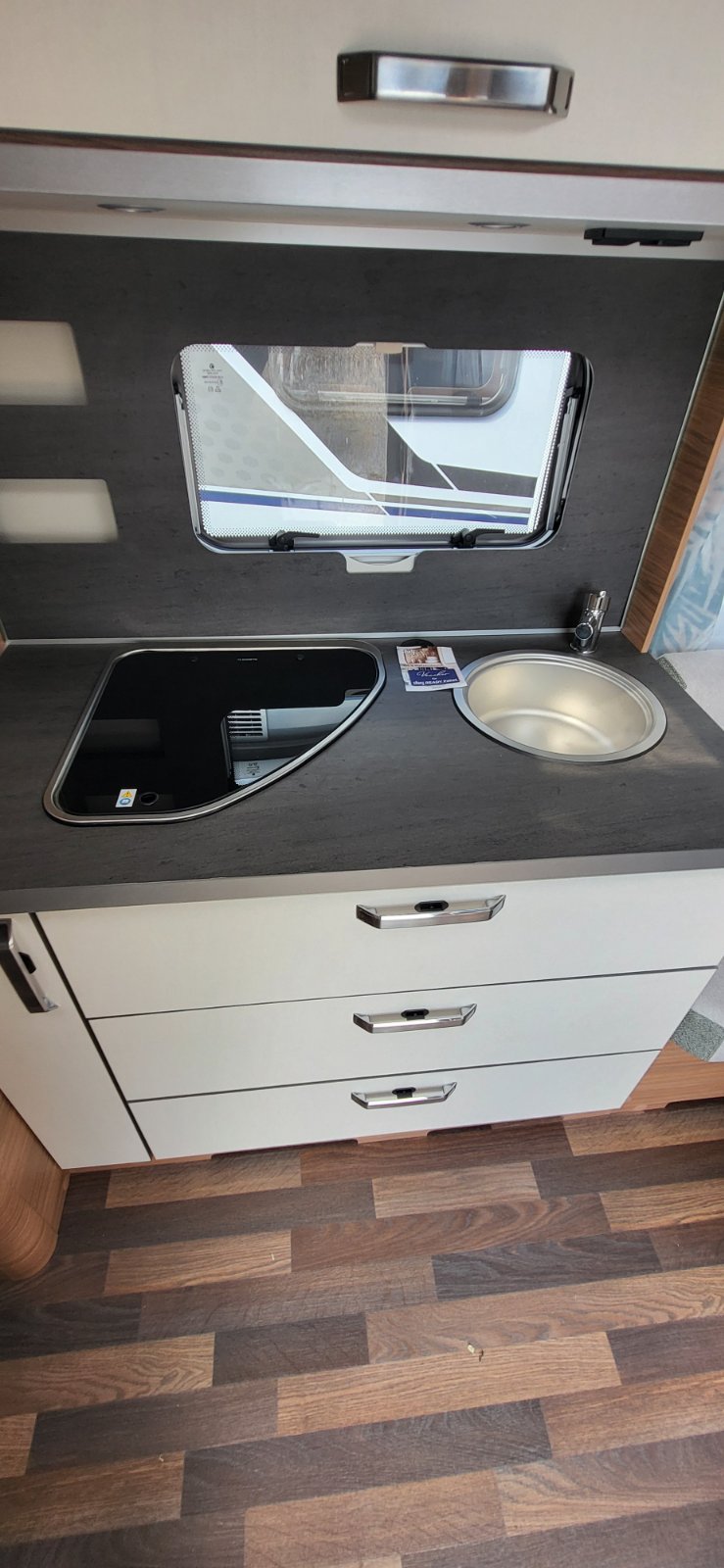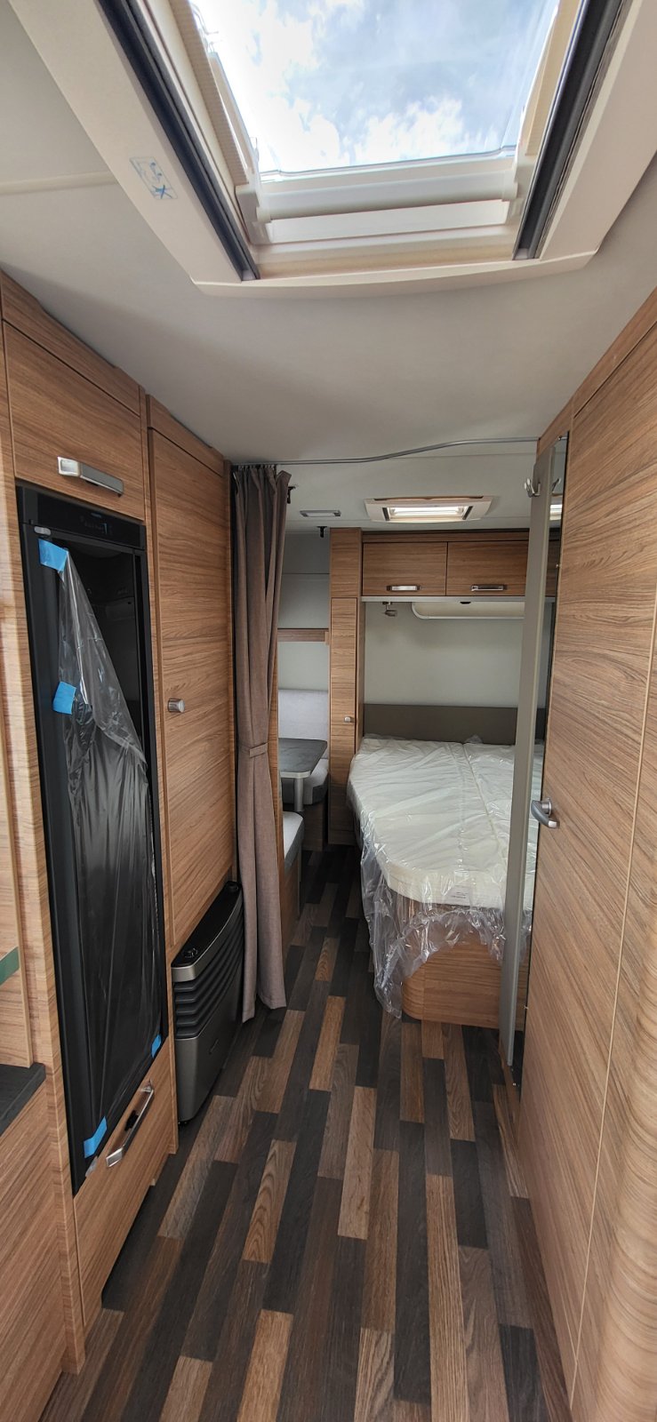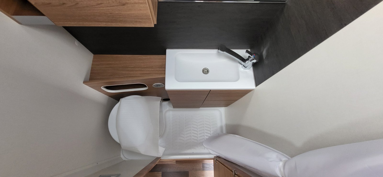 Mosogató, hűtő, tűzhely, 12V-os körfűtés, toronyhűtő, zuhanyfülke zuhanytálcával, beépített mosdóval és bio-Wc-vel, kombiroló, hideg-meleg vízrendszer, 45l-es beépített víztartály, 25l-es mobil szennyvíztartály, panoráma tetőablak, stabilizátoros vonófej, szúnyoghálós ajtó
